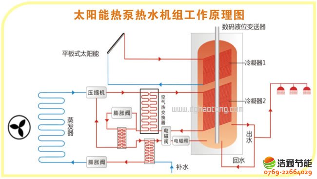 太空能熱水器工作原理與常規(guī)太陽能熱水器不同,它將太陽能熱利用技術(shù)與熱泵技術(shù)以互利的形式結(jié)合起來,通過消耗少量的電能,將周圍環(huán)境中的大量低品位能源(太陽能、空氣等)利用起來,經(jīng)熱泵壓縮機壓縮變?yōu)楦咂肺荒茉础?/p>