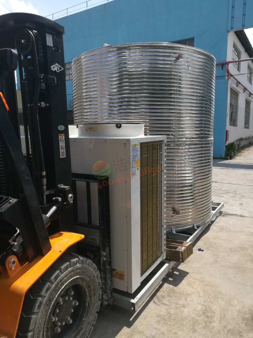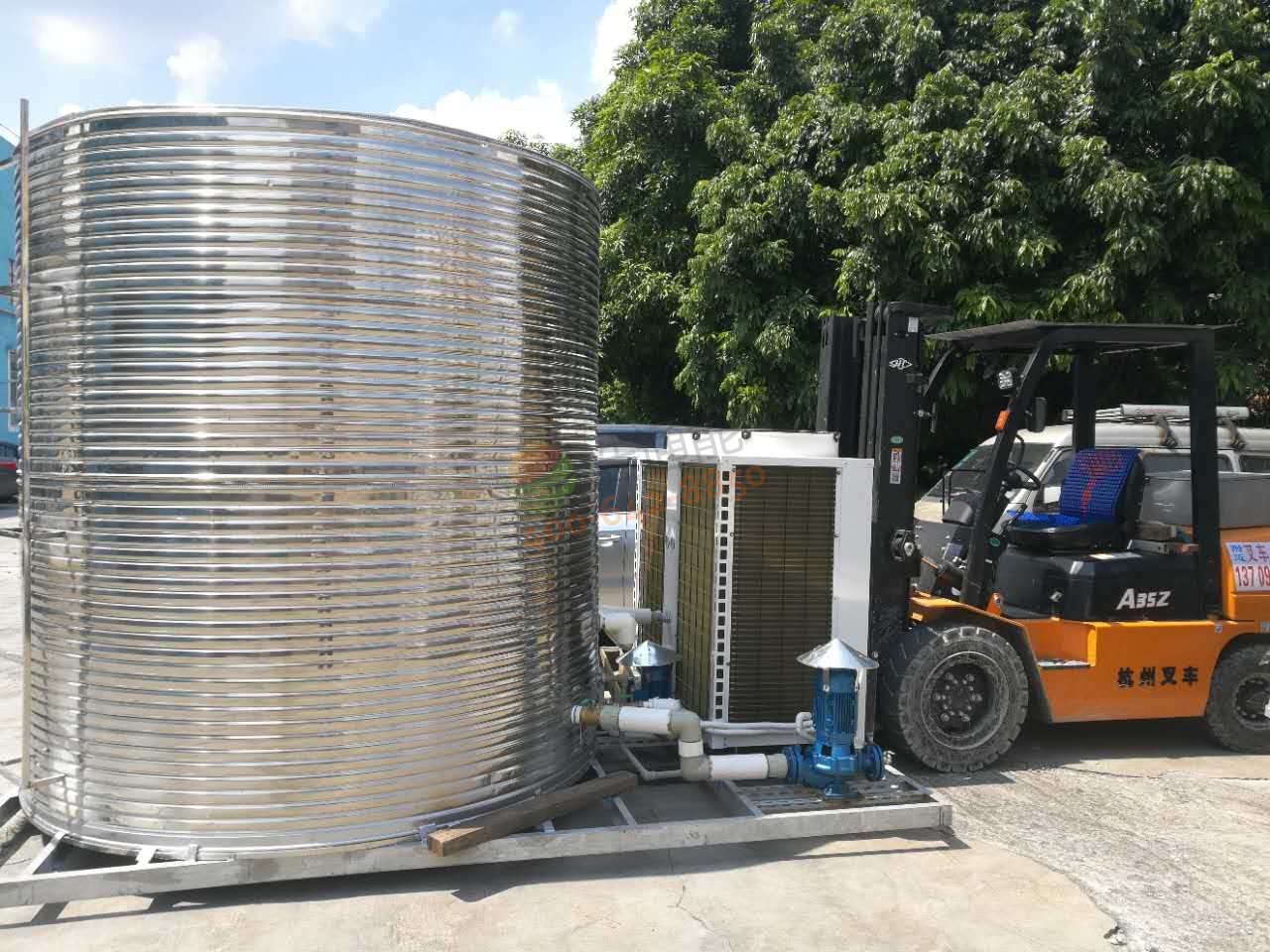 浩通能空氣能熱泵主機(jī)KFRS-33II(10P)1臺,配8.5噸不銹鋼保溫水箱1個及相關(guān)配套設(shè)施,為浩通能空氣能整體式熱水器設(shè)備一套
