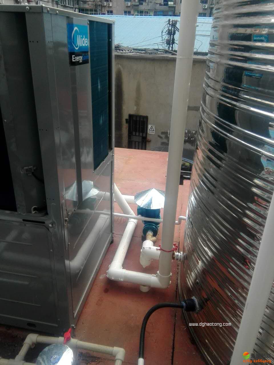 湖北黃石如家酒店10匹10噸美的空氣能熱泵熱水工程項(xiàng)目——主機(jī)與水箱管道連接