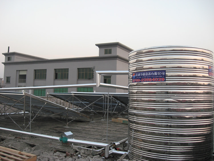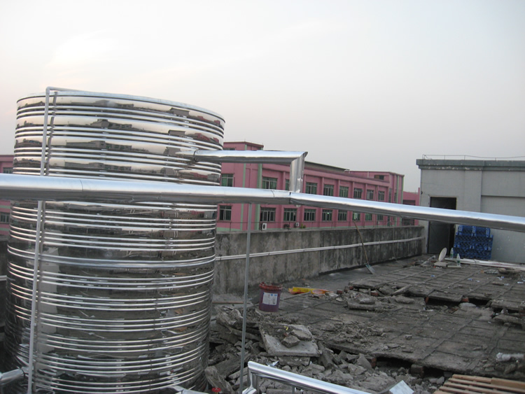 太陽能中央熱水系統(tǒng)配裝的不銹鋼保溫水箱均安裝在樓面上。