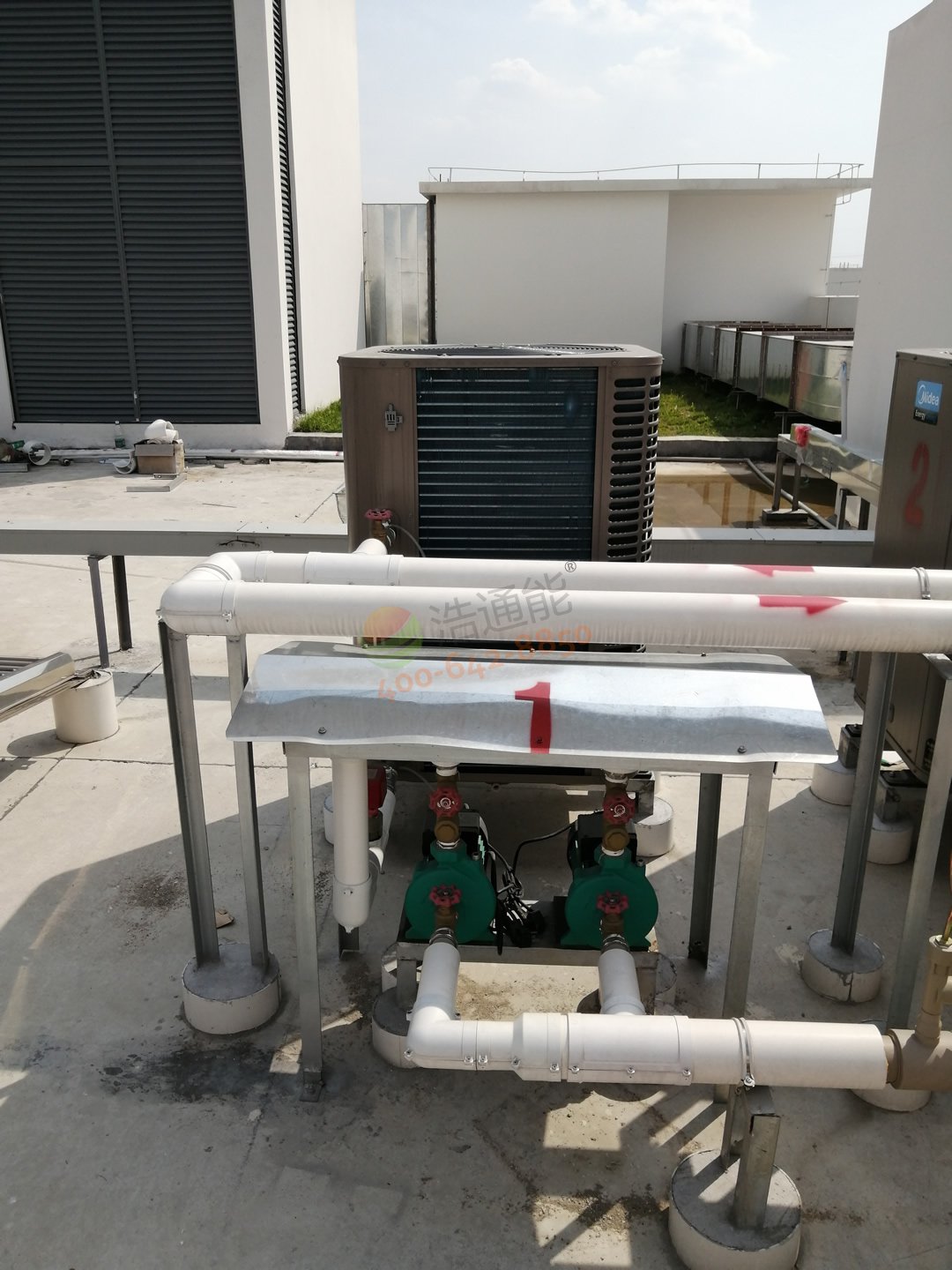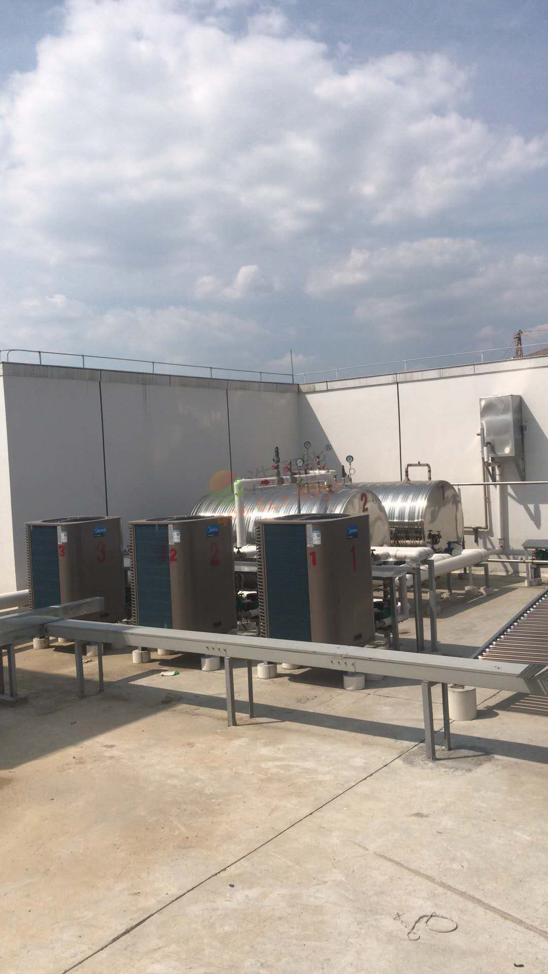 廣州白云機(jī)場(chǎng)綜合保稅區(qū)南區(qū) - 15噸太陽(yáng)能+空氣能熱水工程3臺(tái)熱泵主機(jī)安裝效果