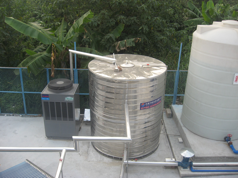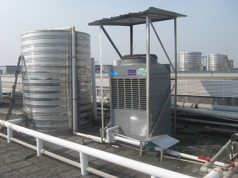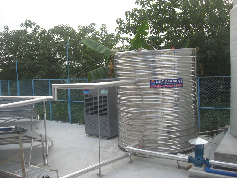 東莞綠揚(yáng)鞋業(yè)有限公司10000人員工宿舍400噸水太陽(yáng)能+空氣能熱泵熱水工程主機(jī)與保溫水箱連接